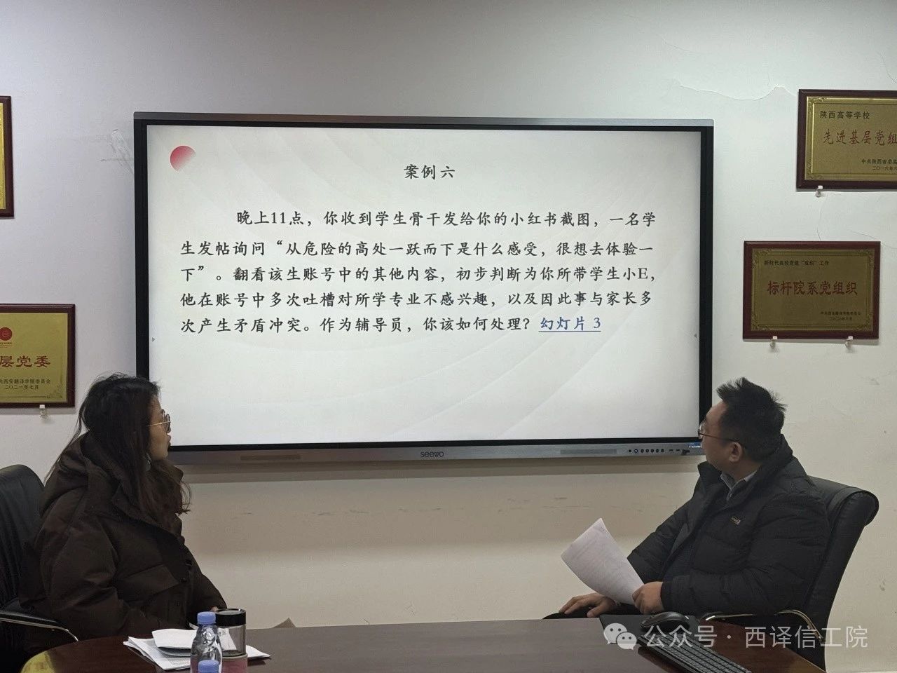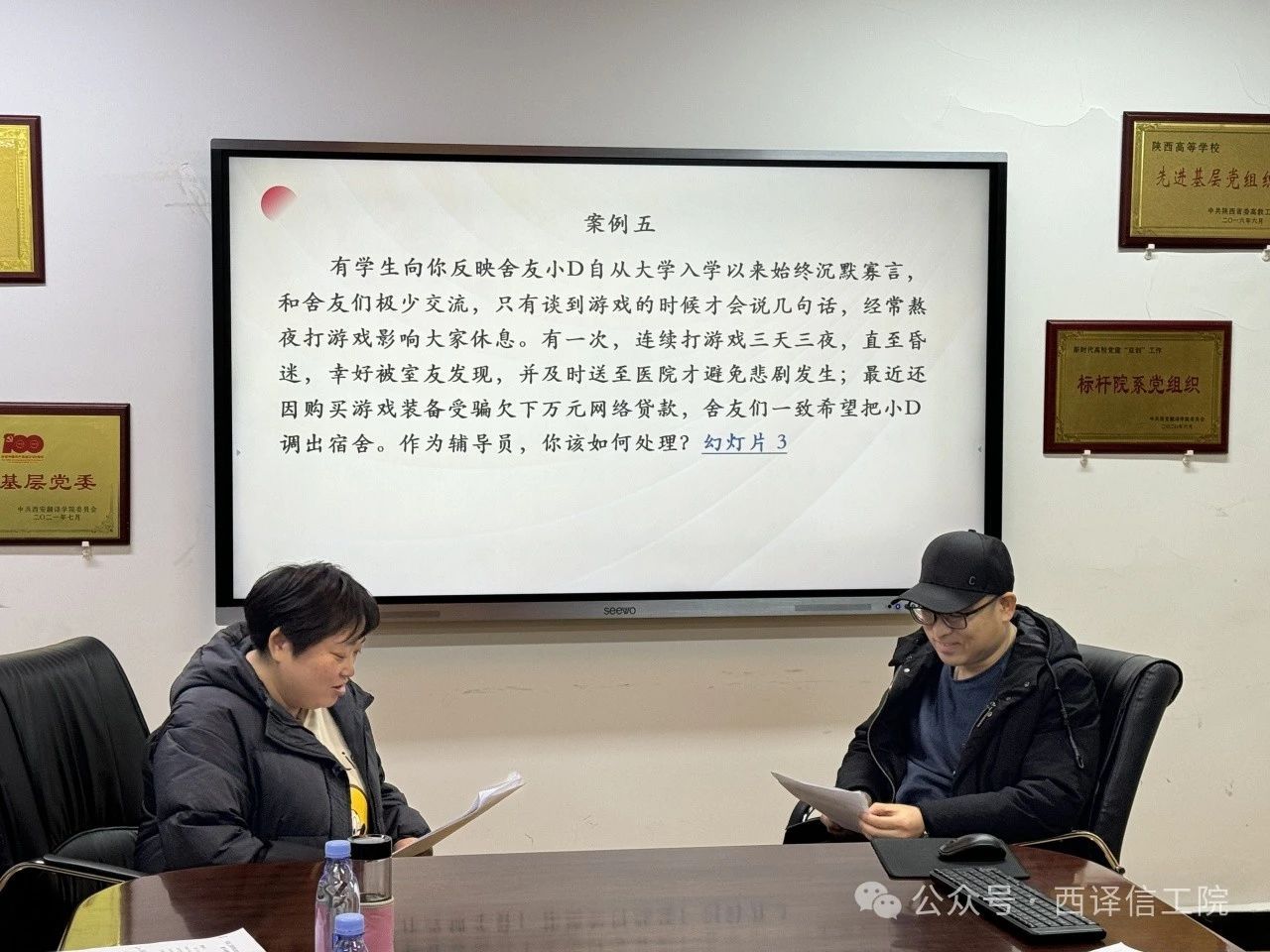 为进一步加强学院辅导员队伍职业化和专业化建设,着力提升辅导员的专业素养与工作能力,切实增强学生管理工作的规范性与实效性,12月13日,信息工程学院在党员活动室举办2024—2025年辅导员素质能力提升训练营学院学情测验和案例研讨比赛。学院党委书记、副院长赵桢宇、综合办副主任王晓东、护理与康复学院综合办副主任周艳萍、学工部曹勇担任评委。