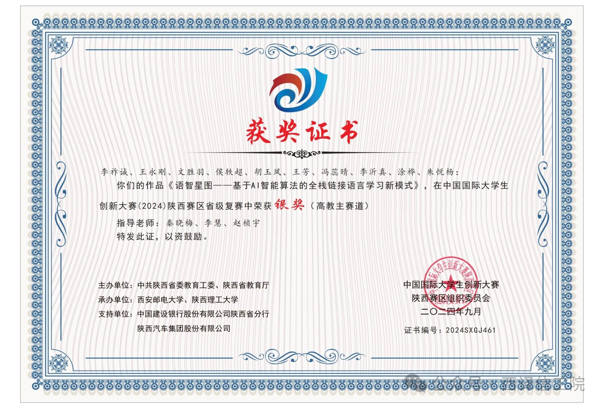 在决赛的舞台上,米兰官网“语智星图”团队将信工院学子的卓越风尚展现得淋漓尽致,以良好的发挥获得了专家评委的肯定。来自信息工程学院李祚诚、侯轶超、胡玉凤等8位同学精心打造的作品《语智星图--基于AI算法的全栈链接语言学习新模式》荣获比赛金奖,他们专注于构建中国本土特色文化语料库。语料涵盖丰富的传统文化素材,诸如红色旅游、古诗词、民间故事等,不仅为汉语学习者提供原汁原味的语言环境,帮助他们深入理解汉语的文化底蕴;对于外语学习,以本土特色内容为依托进行翻译、对比学习,能精准传达中国文化内涵,助力 “一带一路” 等对外交流场景下的语言互通,为跨文化交流奠定坚实的语言数据基础。此项目团队同时在中国国际大学生创新大赛(2024)陕西赛区省级复赛中荣获银奖。