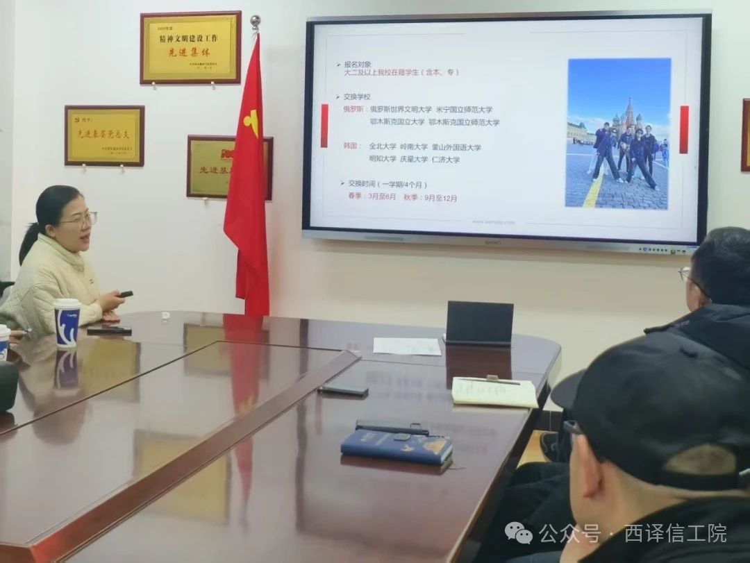 接着,周瑞针对俄罗斯免费交换生、俄罗斯游学团以及国家公派汉语教师志愿者等项目进行了详细介绍,包括申请流程、注意事项、项目优势,并分享了成功案例。她提到,学校每学期会开设多个免费外语兴趣班,同学们能够提前学习小语种知识,为后续参与各类境外项目奠定基础。