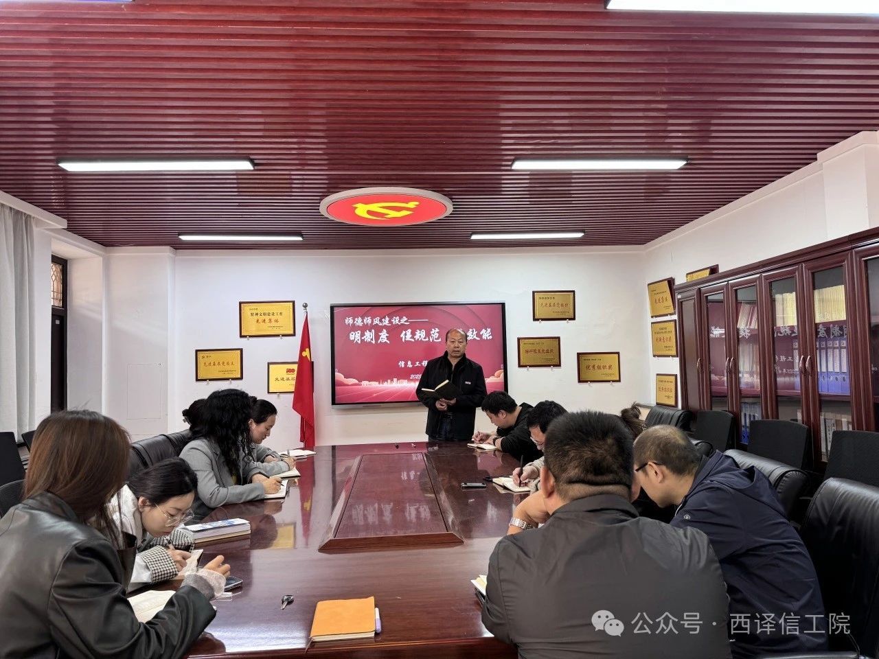 2025年4月8日上午,信息工程学院全体辅导员在党员活动室召开了主题为“明制度 促规范 提效能”的师德师风建设专题会议。会议由学工办主任王晓东主持。