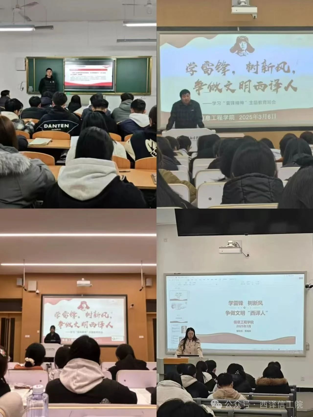 为弘扬雷锋精神,培育和践行社会主义核心价值观,营造文明和谐的校园氛围,信息工程学院各班召开了“学雷锋,树新风,争做文明西译人”主题班会。旨在通过学习雷锋事迹,引导同学们领会雷锋精神中蕴含的崇高理想信念、奉献精神、敬业精神。此次班会鼓励大家将雷锋精神融入日常生活,用实际行动传递爱心与温暖,努力成为有理想、敢担当、能吃苦、肯奋斗的新时代好青年,为构建文明和谐的校园贡献自己的力量,让雷锋精神在校园中绽放新的光彩。