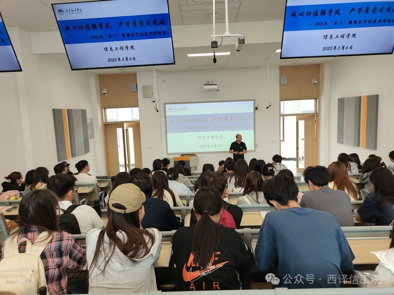 信息工程学院于2025年5月6中午12点在722t举行以“收心归位强学风 严管厚爱求突破”为主题的“五一”假期后学风建设推进会,此次会议直面近期教学管理中的问题,梳理学院发展优势,并探讨突破方向,旨在进一步提升学院学风建设水平,本次活动由王晓东主持,全体班长,学习委员和文体委员参加。