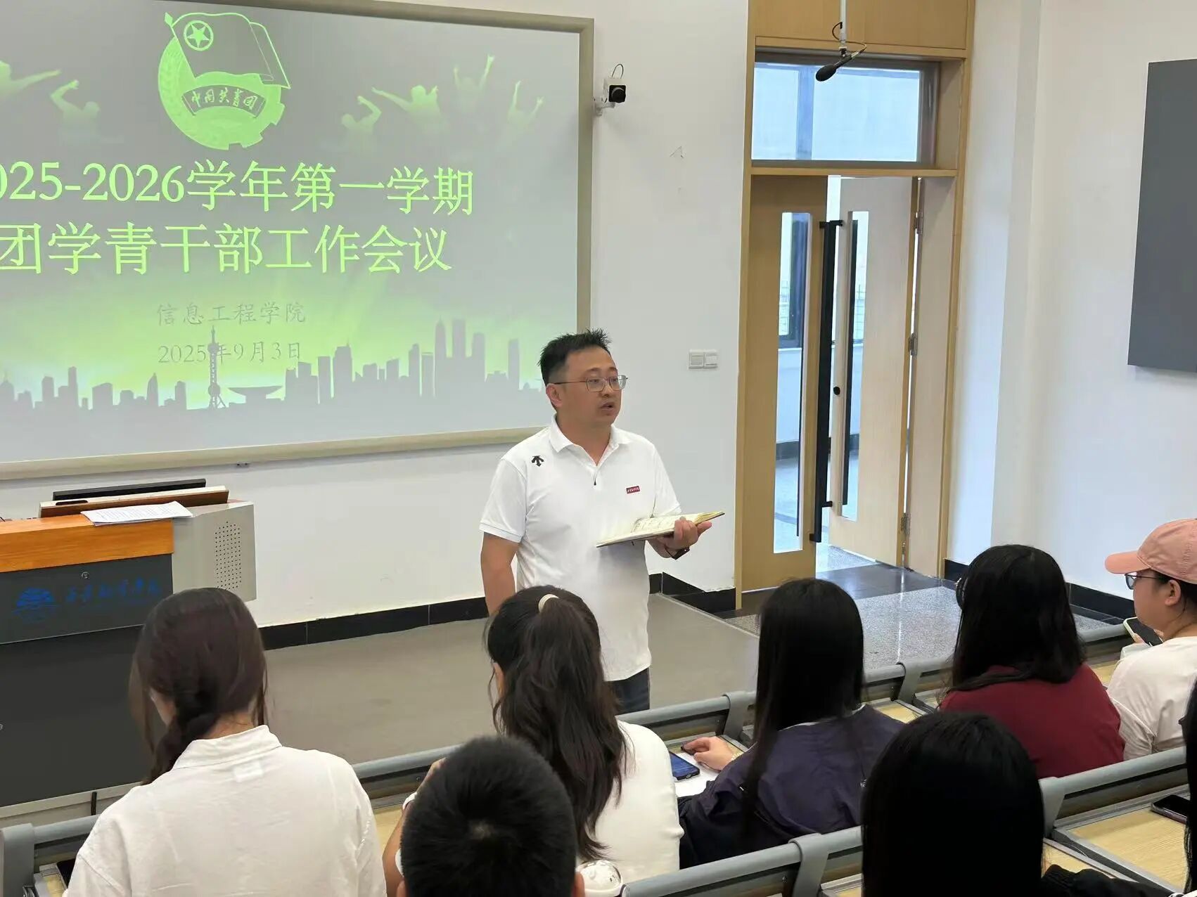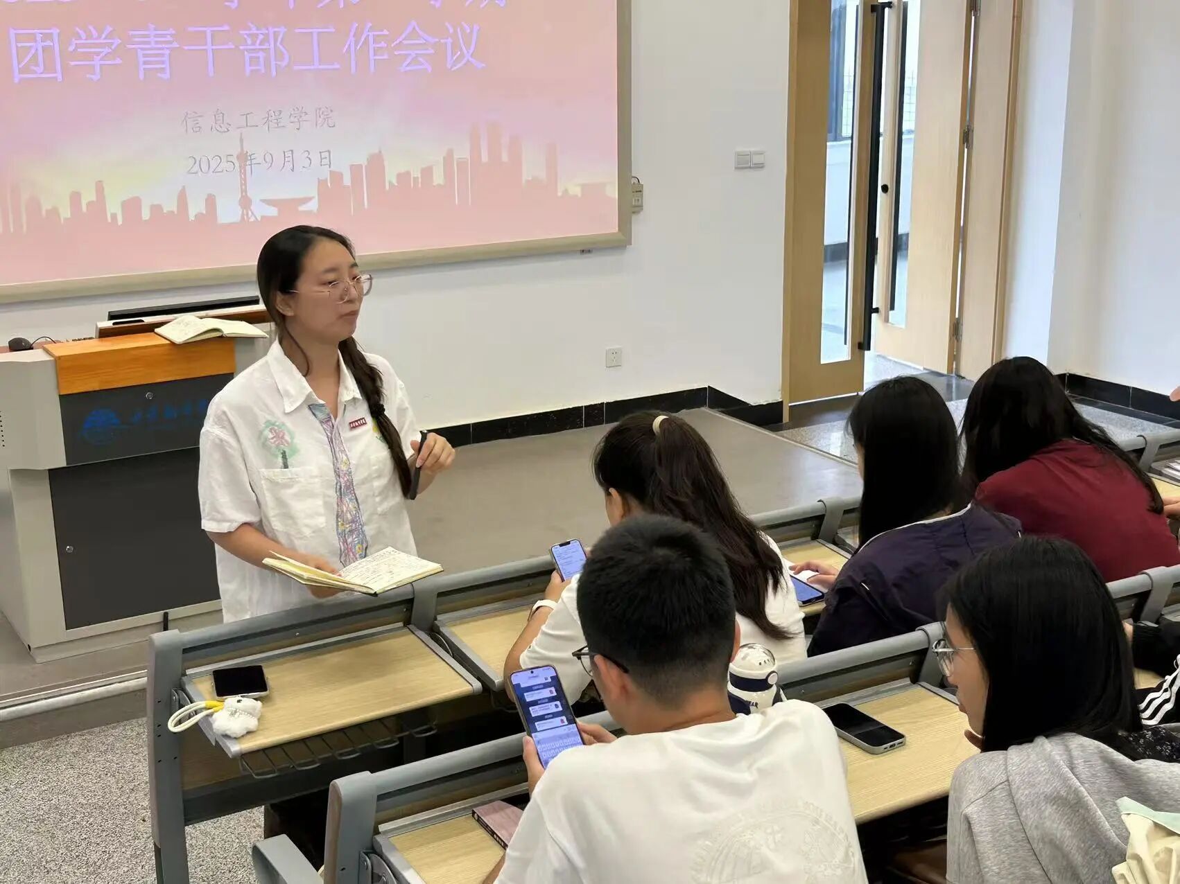 为了总结既往工作、部署新学期任务、凝心聚力开启团学青工作新篇章,信息工程学院于2025年9月3日在722T召开了2025-2026学年第一学期团学青干部工作会议。团总支书记王荣平、副书记陈雨婷及团学青全体干部参会。
