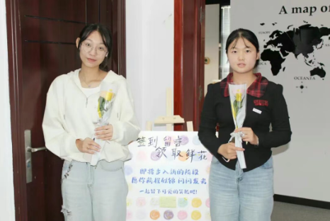 活动启动后,各功能区域迅速吸引师生参与,在“感恩寄语区”,教师们驻足留言展板前,写下对学生成长的殷切期望;学生们则通过便签纸,将对恩师的真诚祝福记录在上;此外,参与签到的学生均获赠鲜花,并亲手将鲜花献给老师,以最质朴的行动传递感恩心意;而“温馨留影区”凭借精心设计的主题背景板与趣味相框,成为现场打卡热点,用镜头定格师生互动的温馨瞬间,为这份珍贵的师生情谊留存永恒纪念。