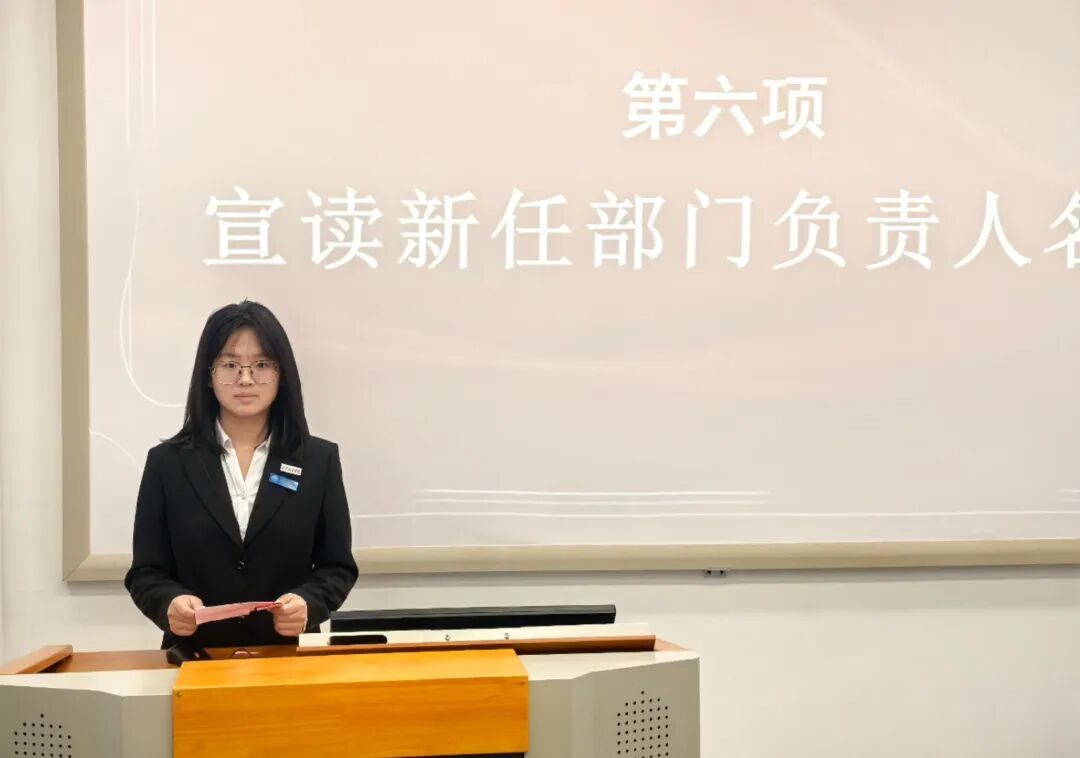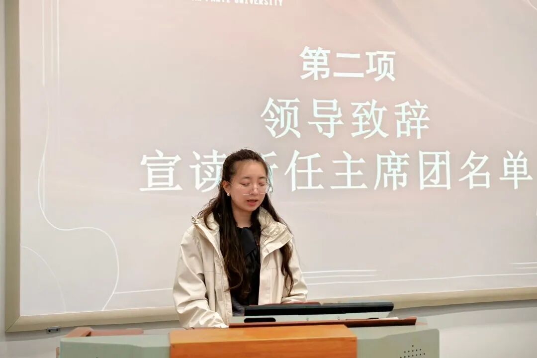 接下来,陈雨婷宣读新任主席团成员名单,并对学生会工作提出几点期望。她强调,全体成员要怀揣服务同学的初心,以明确目标锚定方向、坚定信念筑牢根基;需合理安排时间,保障学业的同时推进工作,实现能力与学业双向提升;更要强化团结协作,相互支持配合,为学生会工作提质增效凝聚力量。