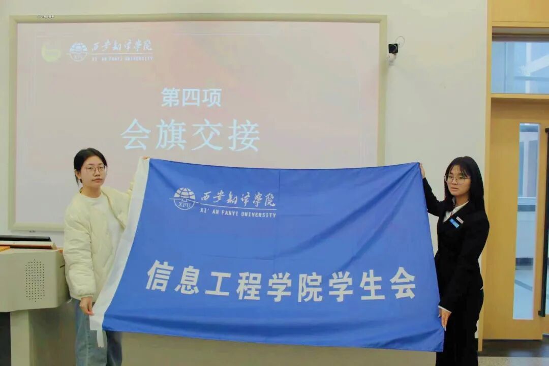 会旗交接-这不仅是旗帜的传递,更是精神的传承,全体成员将接过接力棒,继续以服务同学为宗旨,团结协作,共同书写信息工程学院学生会新篇章。