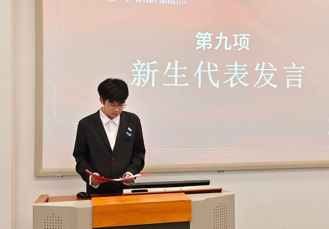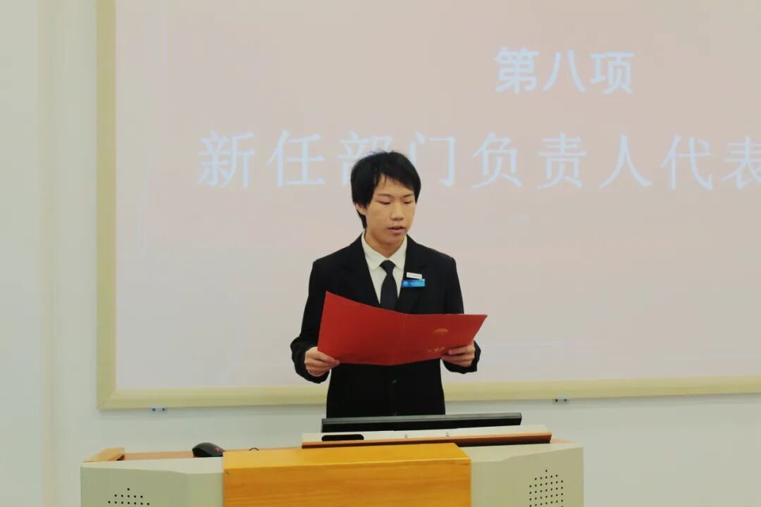 新生代表周鑫在发言中表示,将以学长学姐为标杆,始终保持积极向上的精神风貌,勇于直面工作中的各类挑战;同时会合理平衡学业与工作,主动探索创新工作方法,加强团队协作配合,最终以扎实的实际行动为学院建设与发展注入青春力量。