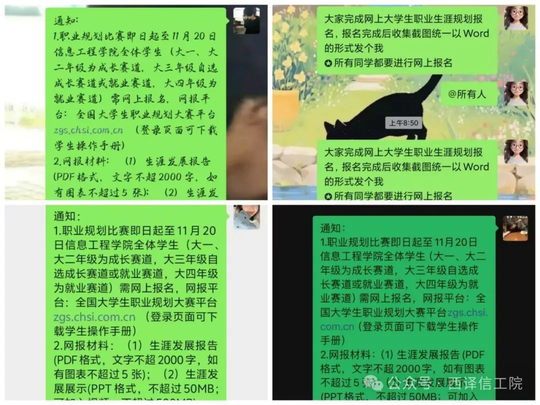 为了推动学院2024年职业规划大赛的顺利举行,信息工程学院各班级于11月12日至11月14日开展了2024年职业规划比赛宣传活动及班级推选赛,使学生更好地了解全国大学生职业规划大赛。