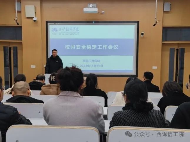 11月19日下午,信息工程学院在712T教室召开学院校园安全稳定工作会议。学院党委书记、副院长赵桢宇、综合办主任胡亚明、副主任王晓东、各系主任以及全体辅导员参加会议。会议由赵桢宇主持。