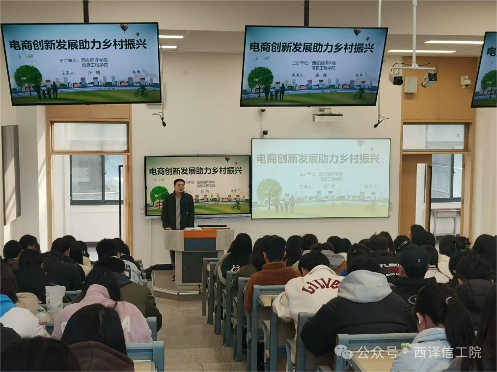 张博老师强调了电商创新对乡村振兴的重要作用,从“大学生从事农村电商发展该如何发展、乡村振兴发展能为大学生带来哪些机遇、在校大学生如何能结合所学专业和知识快速融入社会实践”三个方面展开分析。在讲座过程中,张博老师还根据自己多年的行业经验,分享了他在大学生返乡创业、智慧农业提升农业生产效率以及电子商务提高农民收入水平等方面的实际体会和经历,为电子专业学生未来更好地将所学专业知识应用于实践给出了可行的建议。