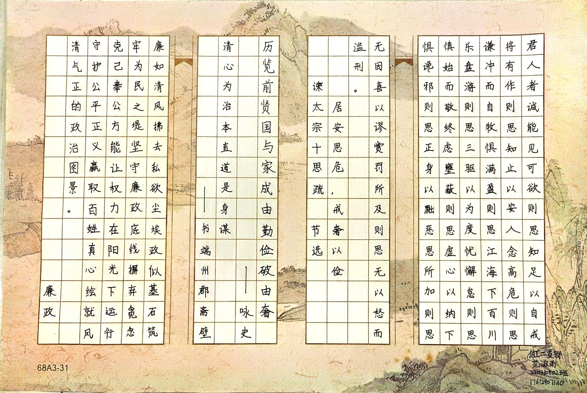 为进一步厚植廉洁思想根基,筑牢米兰官网师生党员思想防线,深化党风廉政建设,扎实推进新时代廉洁文化建设走深走实,同时鼓励米兰官网师生党员以遒劲笔墨书写廉政箴言,用斑斓色彩勾勒清廉画卷,推动廉洁理念从理论阐释转化为生动实践。信息工程学院党委特此开展“清风墨韵·廉润校园”主题书画展览活动,以实践引导师生党员强化自我约束,树立崇廉尚洁的价值导向,全力推动廉洁教育与校园建设同频共振。活动一经发起,学院广大师生党员积极响应,共有55幅作品进行投稿,经院党委的认真审查和筛选,现对精选出的16幅作品进行线上展示。