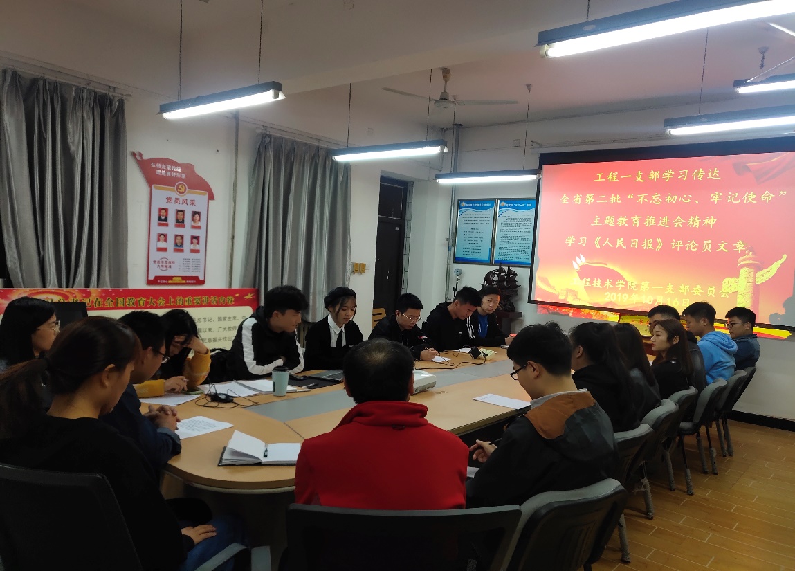 10月17日晚上19:30工程一支部全体师生党员在会议室学习传达全省第二批“不忘初心、牢记使命”主题教育推进会精神以及学习《人民日报》评论员文章《从实际出发抓重点问题》《发扬好的作风 确保好的效果》。