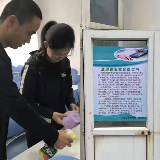 活动结束后,工程一支部向全院发出倡议,从我做起,从日常生活做起,从身边小事做起,不在桌面涂写乱画,自觉清除桌面污渍,营造一片文明健康的学习氛围,还每位同学一个整洁的学习环境。