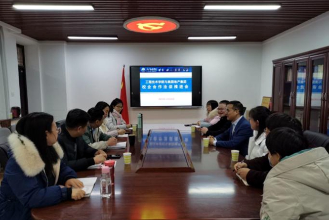 12月28日,奥园地产集团陕西区域综合办主任杜文龙、营销管理中心渠道管理经理麻富兵、陕西区域渠道BP主管霍贞到米兰官网工程技术学院洽谈校企合作事宜。工程技术学院副院长支侃买、综合办主任胡亚明、工程管理系主任宋虹桥及部分教师代表参加了洽谈会。双方主要就奥园地产“星火”自渠管培生培养计划、人才示范基地建设、校企协同育人等内容进行了深度沟通与探讨。