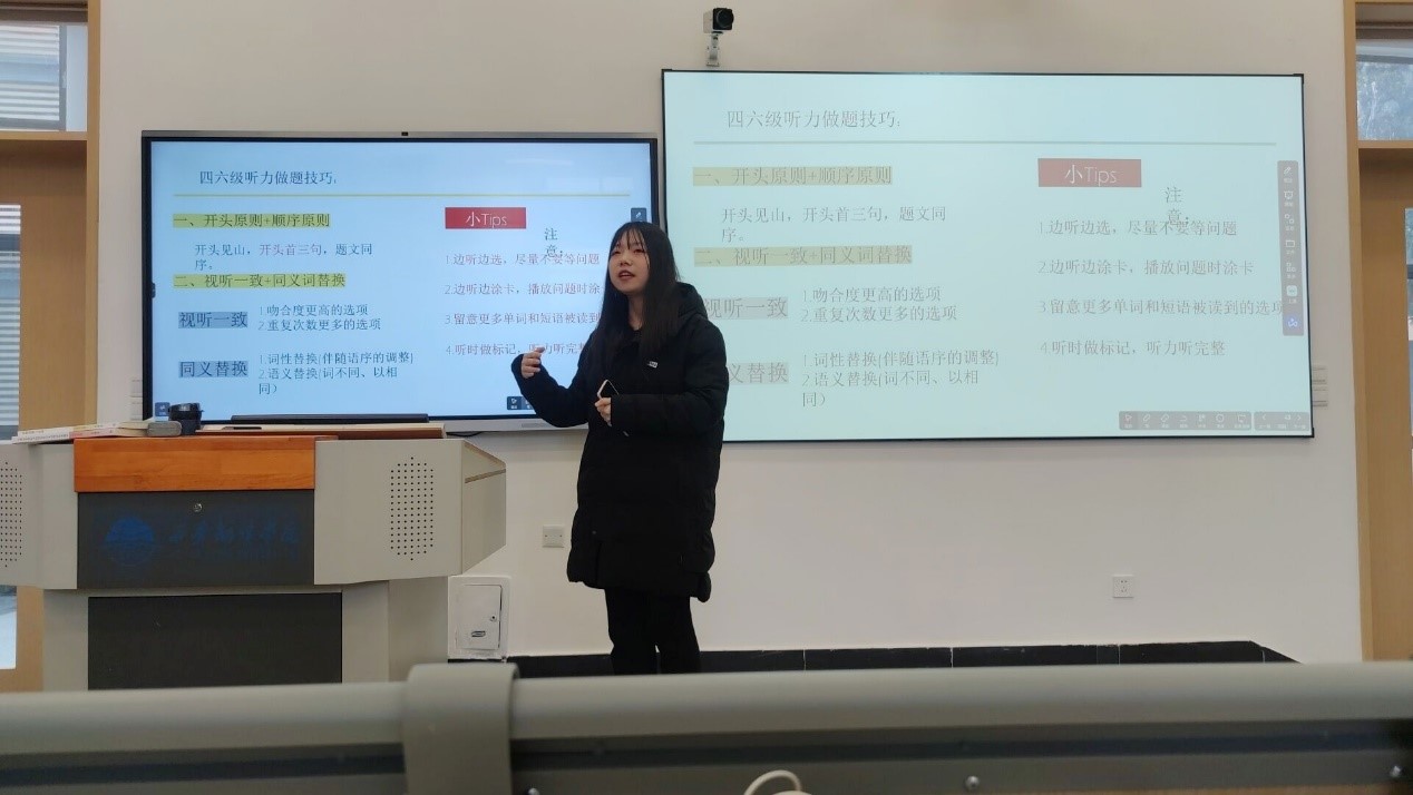 2021年10月28日下午,徐喆在工程技术学院723T为19级本科开展英语四、六级学习经验分享会活动,毫无保留的将自己在英语学习上的方法和技巧分享给大家,坚定了每位同学坚持学习英语的步伐,最后祝愿工程技术学院每一位学子都能在今年的12月顺利通过英语四、六级。