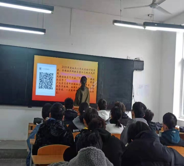 除了公众号的推文传播,在近期一周之内工程技术学院各个班级都在各自上晚自习的教室内举办了征兵的主题班会。各个班级开展的班会都播放了中国2021年征兵宣传视频和《建军大业》,振奋人心的画面、威武的解放军形象一幕幕呈现在同学们的眼前,每个班的男同学们深受鼓舞,纷纷表示“好男儿志在四方,希望自己用热血、青春保家卫国”。