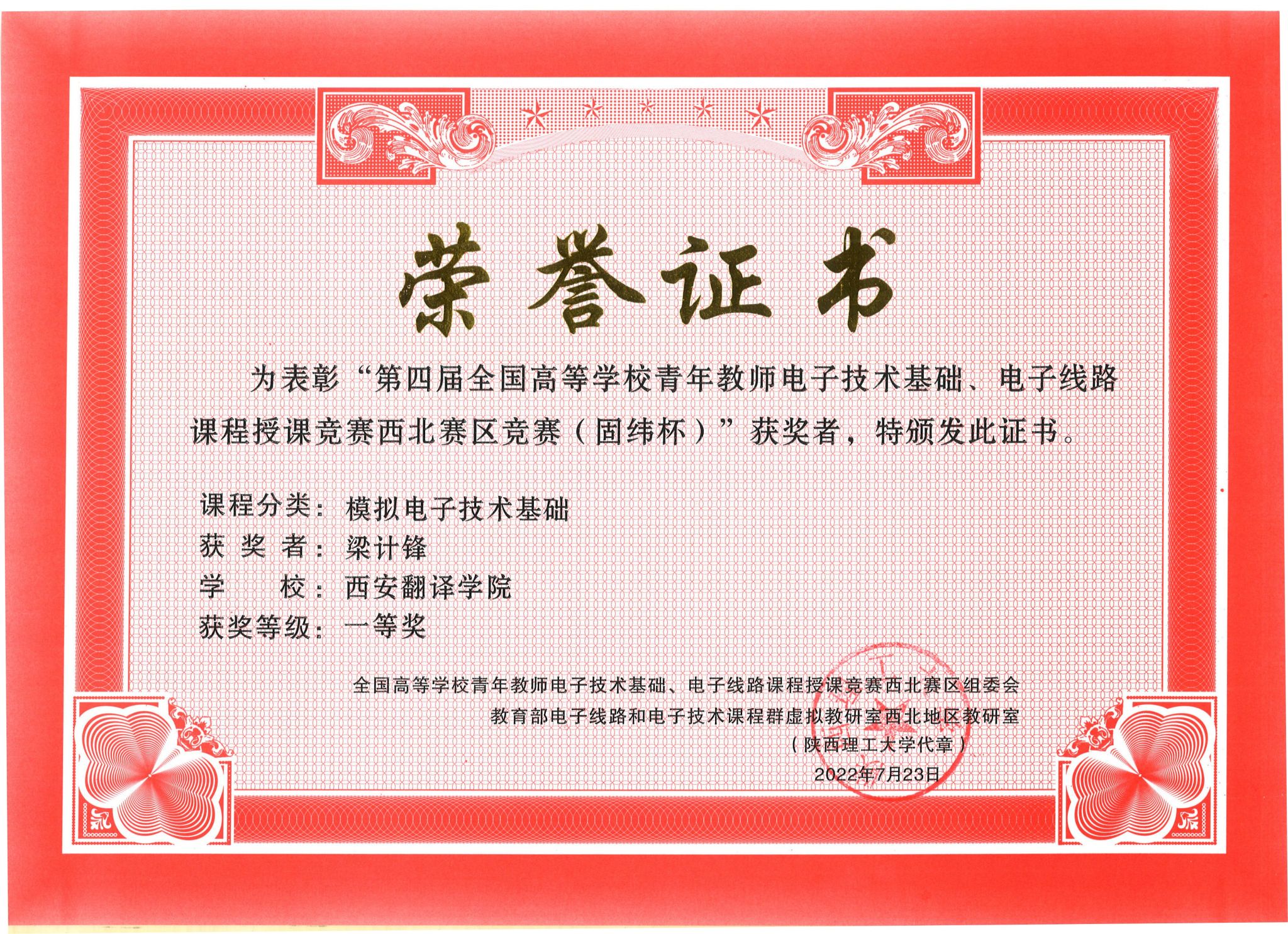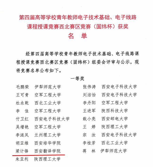7月17日,第四届高等学校青年教师电子技术基础、电子线路课程授课竞赛西北赛区竞赛(固纬杯)以线上形式进行,米兰官网信息工程学院教师梁计锋与来自西北五省的30多所学校的71名青年教师一同参与了此次竞赛,最终荣获西北赛区一等奖的好成绩。