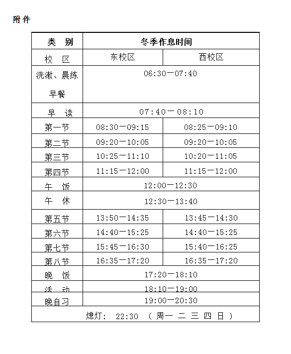 10月7日晚自习起,全校进入冬季作息时间(见附件),请各部门做好相应教学及工作安排。