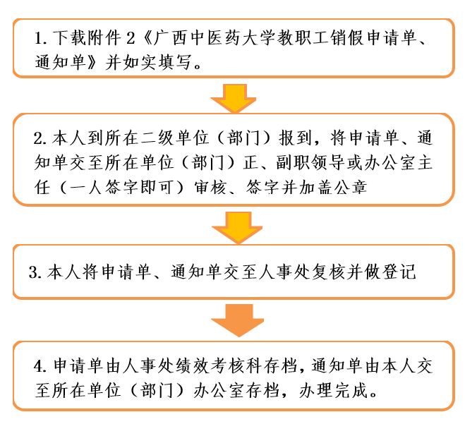 (3)将签字盖章后的申请单、通知单当天内自行交至人事处进行复核并登记,确认无误后人事处工作人员填写销假日期并加盖人事处公章;
