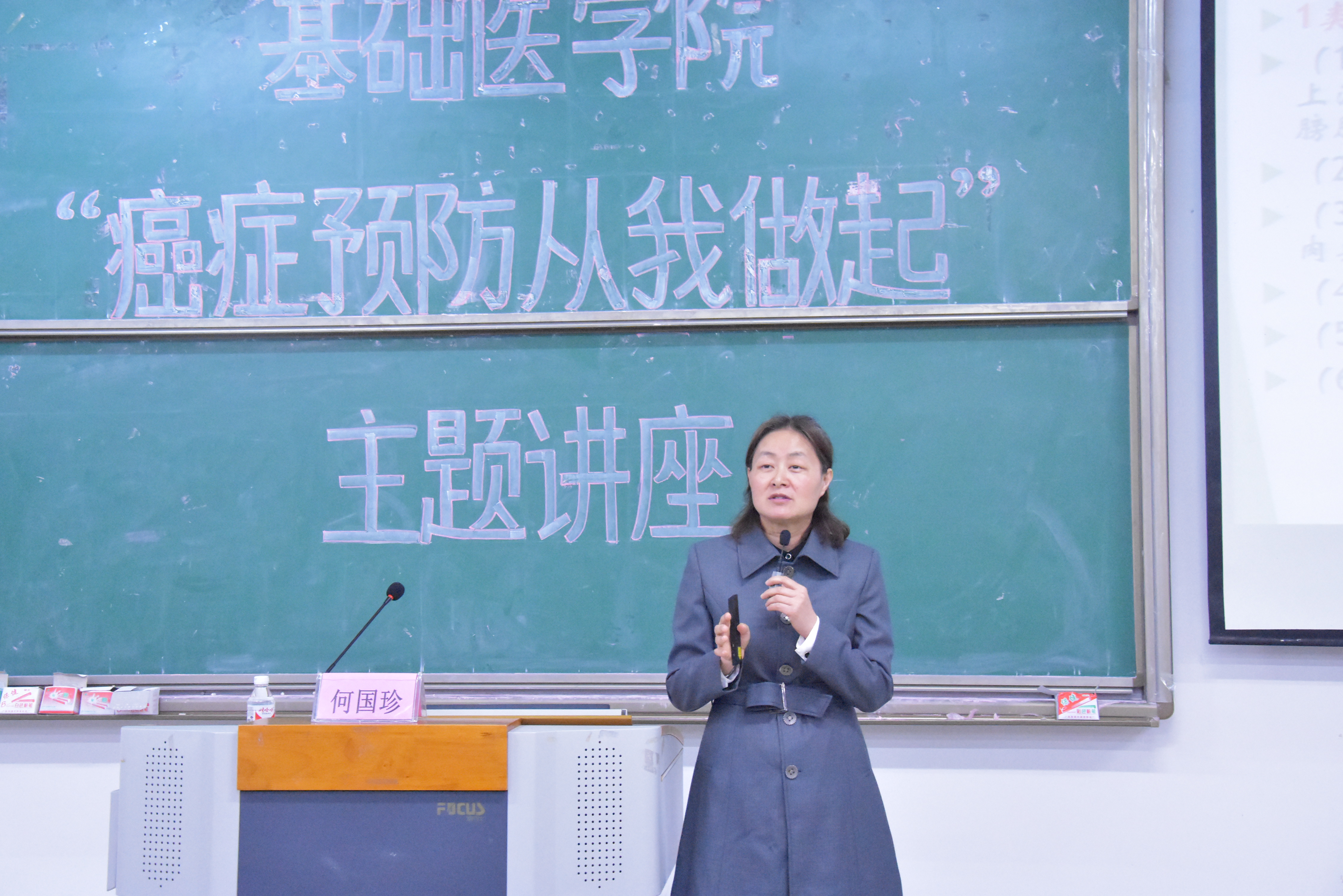 为给我院学生搭建更加丰富第二课堂学习平台,促进我院学风建设,增进大学生与优秀博士之间的沟通交流,基础医学院特开办“博士讲堂,每月一讲”活动。3月29日晚在教学楼1栋201教室,“博士讲堂”之何国珍博士讲《癌症预防从我做起》,基础医学院300多名学生参加本次讲座。