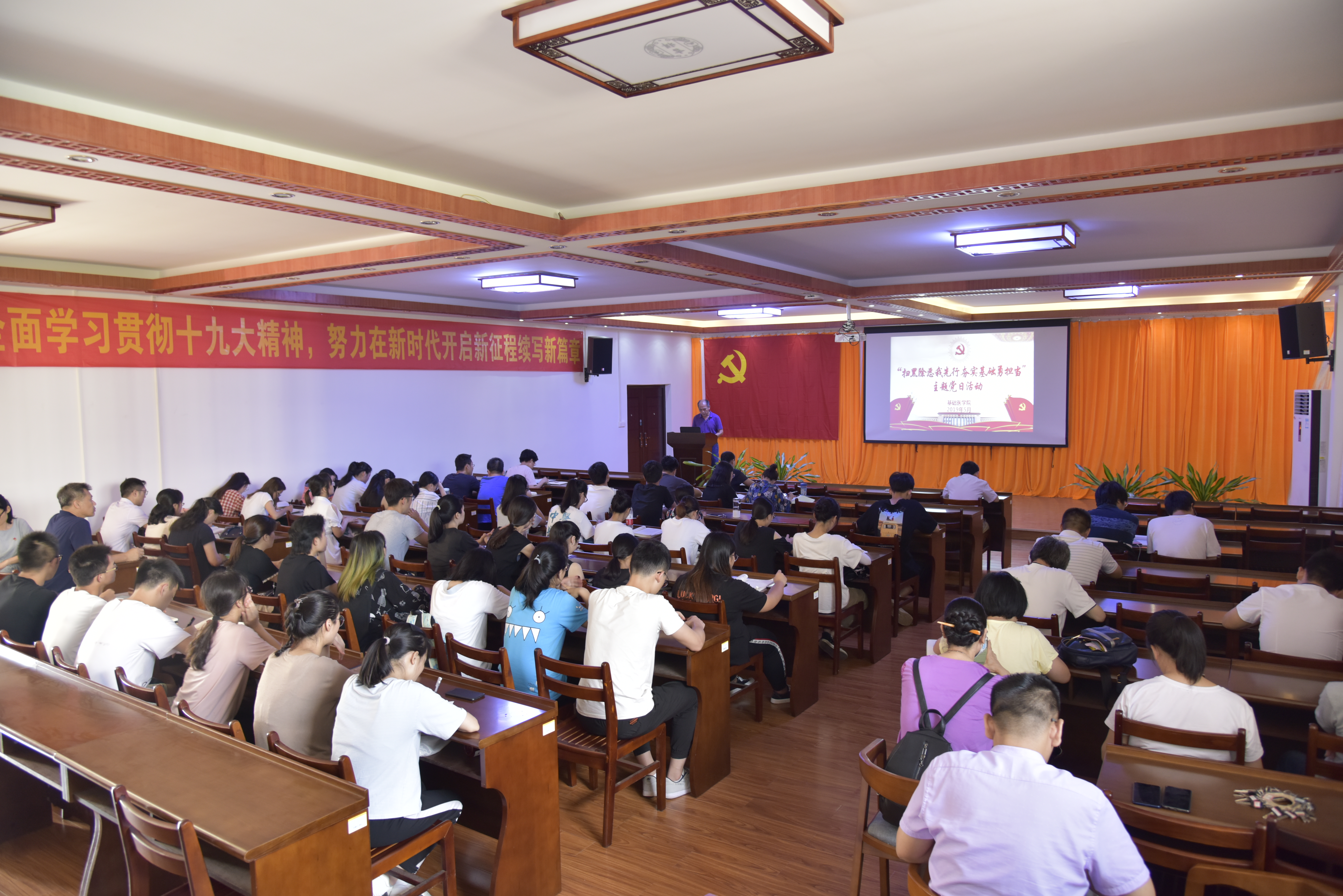 为深入贯彻落实习近平总书记关于扫黑除恶专项斗争的重要批示精神,扎实做好中央扫黑除恶第17督导组反馈问题整改工作,营造全民参与扫黑除恶的浓厚氛围,深入推进扫黑除恶专项斗争,切实扫除黑恶势力,全面提高学院师生对扫黑除恶专项斗争的知晓率及参与度,保障人民安居乐业,提升人民群众满意度、幸福感。基础医学院于5月16日开展了以“扫黑除恶我先行 夯实基础勇担当”为主题的党日活动,学院全体党员、发展对象、入党积极分子参加活动。