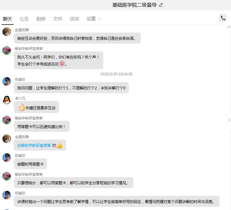 学院教务办每周按照课表顺序选取1至2门课程,并将线上课堂平台地址、上课时间、主讲老师等信息的提前发布学院二级督导QQ群,并指导二级督导进入线上课堂进行听课。在听课过程中,督导们对教师的课堂线上进行热烈讨论,而且认为特殊时期进行网上集体听课的模式非常好,教务办课后及时将意见反馈至任课教师。