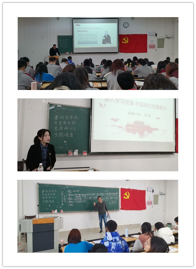 首先,第一讲由基础医学院辅导员张翼鹏带来的主题为“新形势下意识形态分析”讲座,带领在座入党积极分子一起学习了新形势下意识形态的现状和应对策略,让大家了解到什么是意识形态、意识形态的发展历程和党员意识形态工作能力。接下来,第二讲由基础医学院学生第一党支部书记黄媚带来的“深入学习党章,牢固树立党员意识”的学习,详细对“党章”内容进行讲解,同时结合观看党员在抗疫期间的视频,让同学们深刻认识到树立党章学习的重要性,而且时刻应以“党员身份”来规范和要求自己的行为。最后,由基础医学院学生第二党支部书记和卫宾老师向同学们讲解了入党条件和流程,详细介绍了从递交入党申请书到成为正式党员中的每一阶段所需具体要求和完成的工作,同时希望同学们能够不忘初心,努力学习党的理论知识和专业知识,严格要求自己,争取早日成为一名优秀的共产党员。