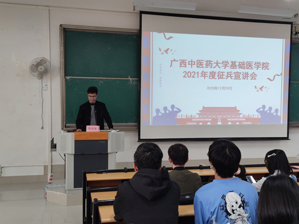 为扎实做好基础医学院2021年征兵宣传教育工作,充分调动全院支持和参与征兵工作的积极性,激发广大适龄青年参军报国热情,圆满顺利完成“一年两征”工作任务,基础医学院于12月29日在点点体育仙葫校区教学楼召开了2020-2021学年大学生春季征兵宣讲大会。出席本次大会的有学校武装保卫部(处)副部(处)长陆会林、学校武装保卫部(处)教员王怿清、基础医学院党委副书记龙春莉、基础医学院学生工作办公室辅导员张翼鹏、康浩,以及2019级临床医学专业何子拓、2019级口腔医学专业曾祥军、2019中医学师承班梁海林三位退伍复学学生以及各班学生代表共300余人。
