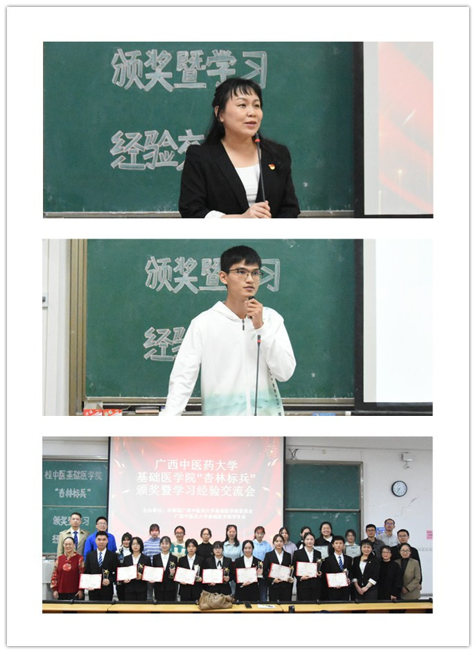 为了更好发挥基础医学院优秀大学生榜样引领作用,更好营造良好的学习和积极向上的氛围,激发学院大学生树立“立大志、明大德、成大才、担大任”的理想信念,基础医学院特开展学年“杏林标兵”系列评选活动,对每学年的学习标兵、学霸宿舍、学优班级以及十大学院明星等先进个人和集体进行隆重的表彰。2021年12月3日晚在仙葫校区1-209教室,隆重举行2020-2021学年“杏林标兵”颁奖暨学习经验分享会活动,基础医学院党委副书记龙春莉、中基教研室主任蒋筱、全体辅导员、班主任代表以及学生代表参加本次活动,同时面向全院师生进行现场直播。