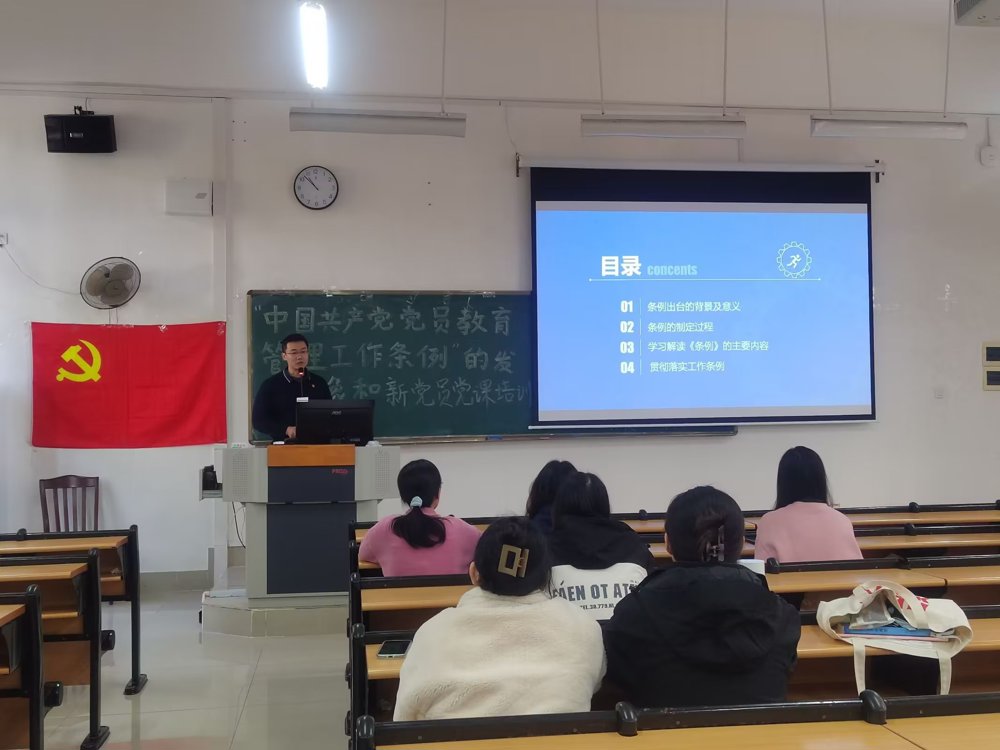 为了让发展对象更加明白自身使命以及规范自身行为,提高党员队伍建设质量,推动全面从严治党向纵深发展,基础医学院学生第一党支部于12月6日上午在仙葫校区教学楼2-107顺利开展了《中国共产党党员教育管理工作条例》(以下简称“条例”)主题党课。本次会议参会人员有基础医学院学生第二党支部书记张翼鹏老师、2023年第2期发展对象及党务助理。