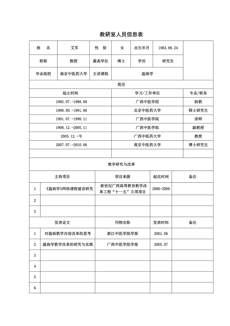 艾军,女,1963年生,医学博士,教授,主任医师,博士研究生导师,广西名中医,taptap点点体育中医临床基础学科学科带头人,中华中医药学会感染病分会名誉副主任委员,中华中医药学会名医学术思想研究分会常务委员,世界中医药学会联合会儿科专业委员会常务委员,广西中医药学会理事。