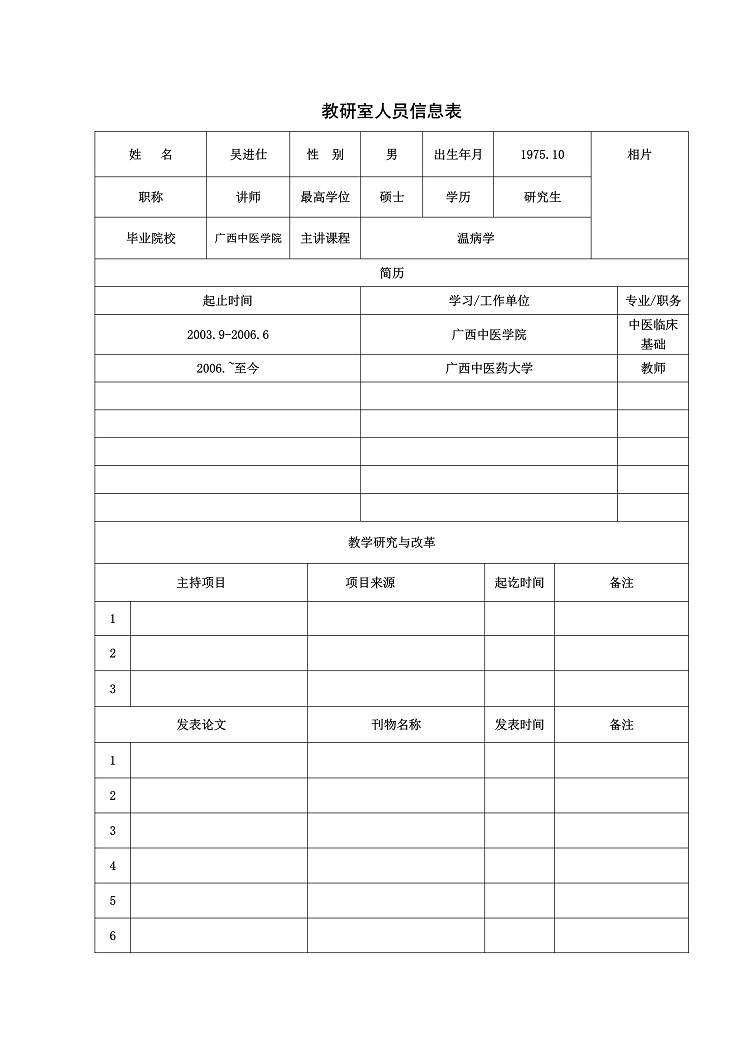 从事中医温病学教学、临床和科研工作20余年,自1999年7月至2003年8月在从事临床实践工作,2003年9月至2006年6于在taptap点点体育师从三代御医之传人艾军教授、博士生导师,攻读硕士研究生,获医学硕士学位,2006年7月至今在广西中医大学温病学教研室历任助教、讲师。主要研究方向温病热郁瘀相关病机理论与临床研究。创新擅长融会贯通把内经、伤寒论、温病学等中医经典融为一炉进行教学工作;并把温病理论运用到临床实践中。主持校级科研课题2项,公开发表学术论文10余篇。