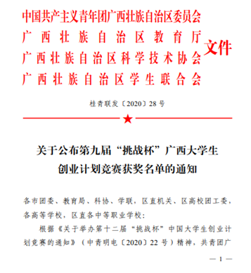 2020年第九届“挑战杯广西壮族自治区大学生创业计划铜奖