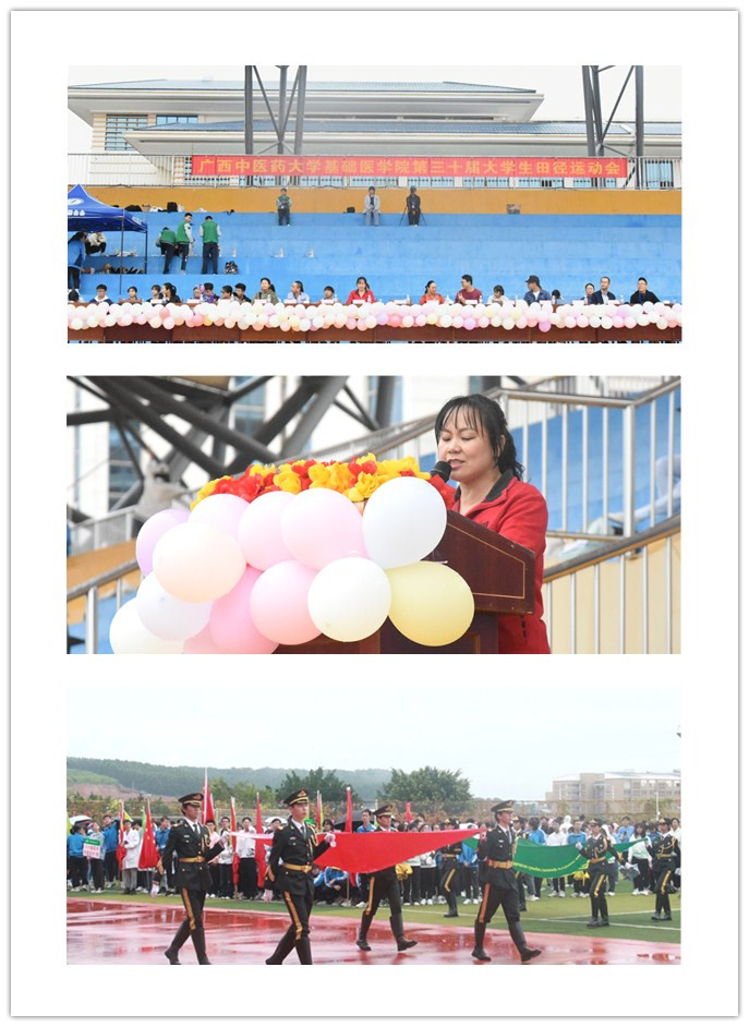 伴随着隆重入场进行曲,国旗队、院旗与校训牌匾方块队踏着坚定的步伐庄严入场,他们双眸有神、身躯挺拔,展现了我院学子朝气蓬勃的精神风貌;随后,裁判员、工作人员方块队、班级方块队喊着响亮的口号有序入场,他们灿烂的笑容、轻盈整齐的步伐,体现了当代大学生的青春与活力。入场仪式结束,全体肃立,面向国旗、校旗,举行了隆重的升国旗、唱国歌和升校旗仪式,伴随着高亢嘹亮的《义勇军进行曲》,全体师生高唱国歌,歌声响彻校园,让人备感振奋。接着,党委副书记龙春莉致开幕词,希望全体同学积极发扬“团结协作、顽强拼搏”体育精神,锻炼良好身体素质,磨练坚强意志品质,努力学习,更好投身伟大医学事业。