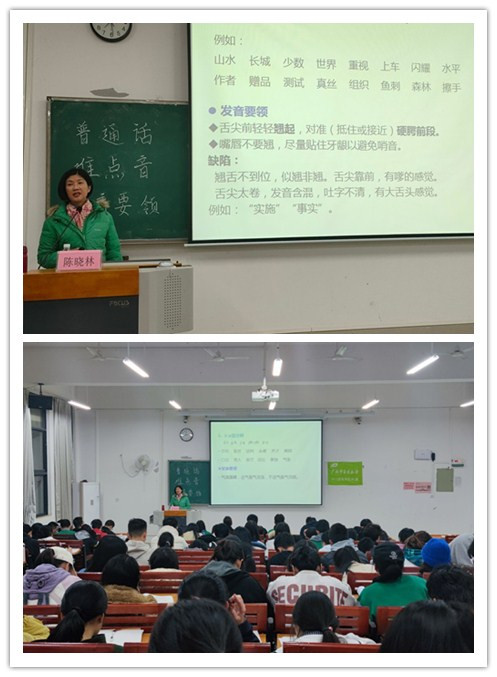 为了增进大学生对普通话了解程度,增强同学们普通话发音技巧,提高大家普通话水平,11月25日晚,在仙葫校区2-304教室,基础医学院特举办“ 医学春秋”系列学术讲座之《普通话难点音发音要领》,由陈晓林副教授主讲,基础医学院近200名学生参加本次讲座。