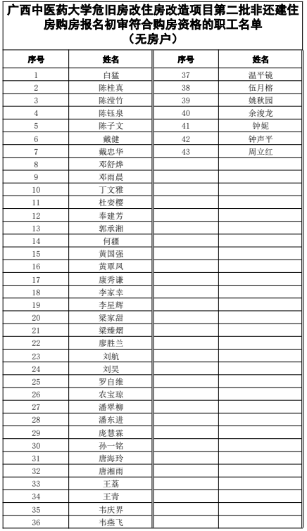 经学校人事处、房管部门初步审核,具有购买非还建住房资格的第二批报名职工(含无房户、未达标户),具体名单详见附件。