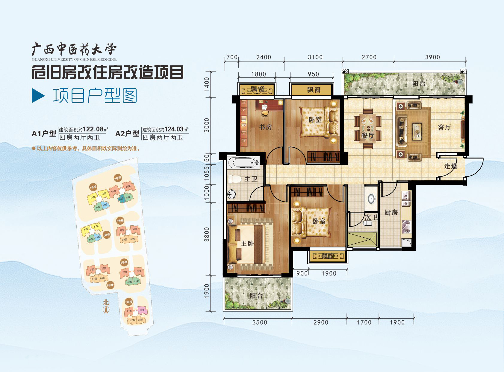 四房两厅两卫(约123.00㎡):1、3号楼(A1、A2户型)