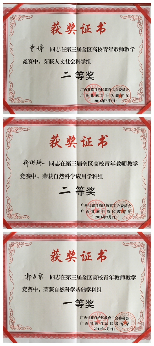7月6日~7日,第三届全区高校青年教师教学竞赛在广西师范大学举行,来自全区34所本科院校(含独立学院)的89名青年教师参加了此次大赛。点点体育选派了三名在校级教学基本功比赛中成绩优异的选手参加了比赛,分别为药学院郭占京老师、护理学院柳琳琳老师、人文社科学院曾婷老师。三名选手在比赛中发挥稳定,勇夺佳绩,其中郭占京老师荣获自然科学基础学科组一等奖,柳琳琳老师荣获自然科学应用学科组二等奖,曾婷老师荣获人文社会科学组二等奖。