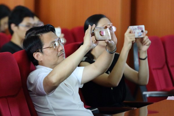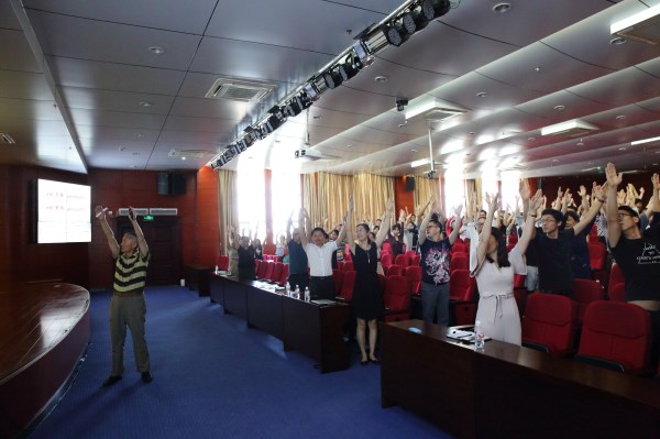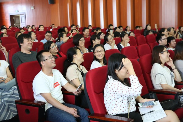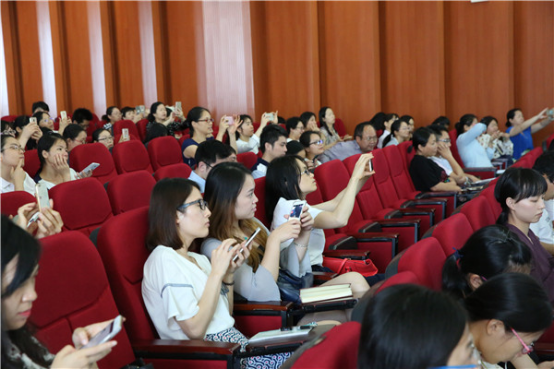 黎教授以风趣幽默的课堂口令互动教学法成功吸引了所有师生的注意力,紧接着提问“到底什么是学习?”让在座的老师展开了热烈的讨论,并鼓励大家通过手机寻找答案。随后黎教授提出了自己的观点——学习即联结,并倡导教师应用技术应该做好三个准备(即“用朋友圈促进教师专业发展”、“用技术提高教学工作效率”、“用技术丰富课堂教与学方式”),并通过三个具体的案例带着老师们运用手机进行现场操作。在整个讲座过程中,黎教授将许多实用的教学应用软件通过扫二维码的形式分享给在座的老师,身体力行地展示了运用技术提高教学工作效率的方式。课间,黎教授还带领所有老师做起了课间瑜伽,鼓励大家做到身体与心灵的放松。整场讲座在轻松活跃的氛围中进行,老师们拿着手机不断给自己“充电”。