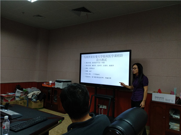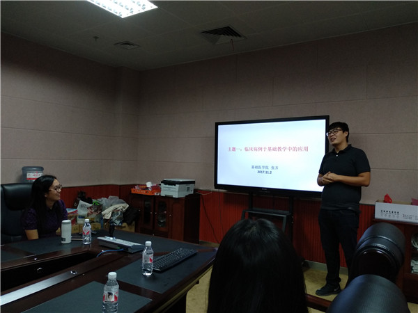 本场沙龙活动由基础医学院的韦燕飞、张齐两位老师主讲,韦老师和张老师均是从马来西亚拉曼大学完成教学能力提升培训的教师队伍中的一员。首先,两位老师通过播放视频的方式让在座教师对拉曼大学的培训有了初步的了解,接着,张老师以“临床病例于基础教学中的应用”为主题,向在座教师介绍了马拉西亚拉曼大学的教学方法,并分享了自己在教学方面的一些收获。最后,韦老师就“医学课程阶段综合小测试与点点体育转段考试现状的观察和对比”的主题,用生动形象的案例详细介绍了拉曼大学临床医学课程阶段小测试的内容,对其中看图说话的题型在座教师都表示值得借鉴。