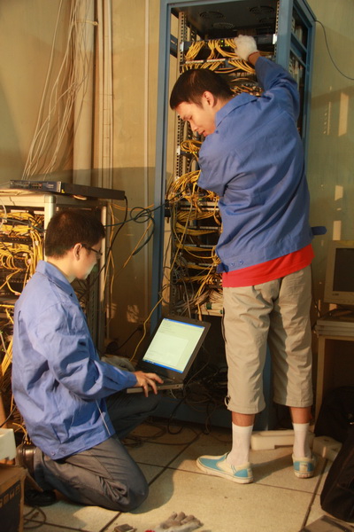 信息网络中心于7月6日整体搬迁至图书馆,还没有安顿好办公场所,中心潘家英主任组织网络管理部技术人员在第一时间到办公楼网络设备房进行了检修,并迅速确定了故障原因:天气炎热以及设备陈旧造成两台交换机烧毁,部分用户无法上网。潘家英主任要求,网络管理技术员要利用自身技术发挥人的主观能动性,创造条件,一定要尽快把办公楼网络恢复,保障办公网络通畅。