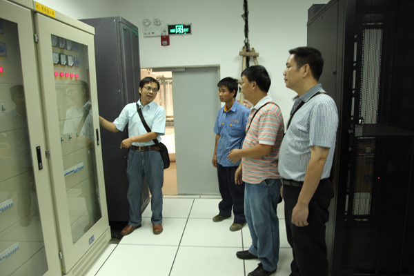 信息网络中心人员一行来到了中心机房进行检查。作为学校固定电话与信息网络的双中心,中心机房内的温度、湿度、防火、机房的端口、配置等都有相关的国家建设标准,信息网络中心领导针对机房内的这些技术细节一一进行了解和现场指导,并对施工单位提出了既要保证通信质量又要布线美观的建设要求。