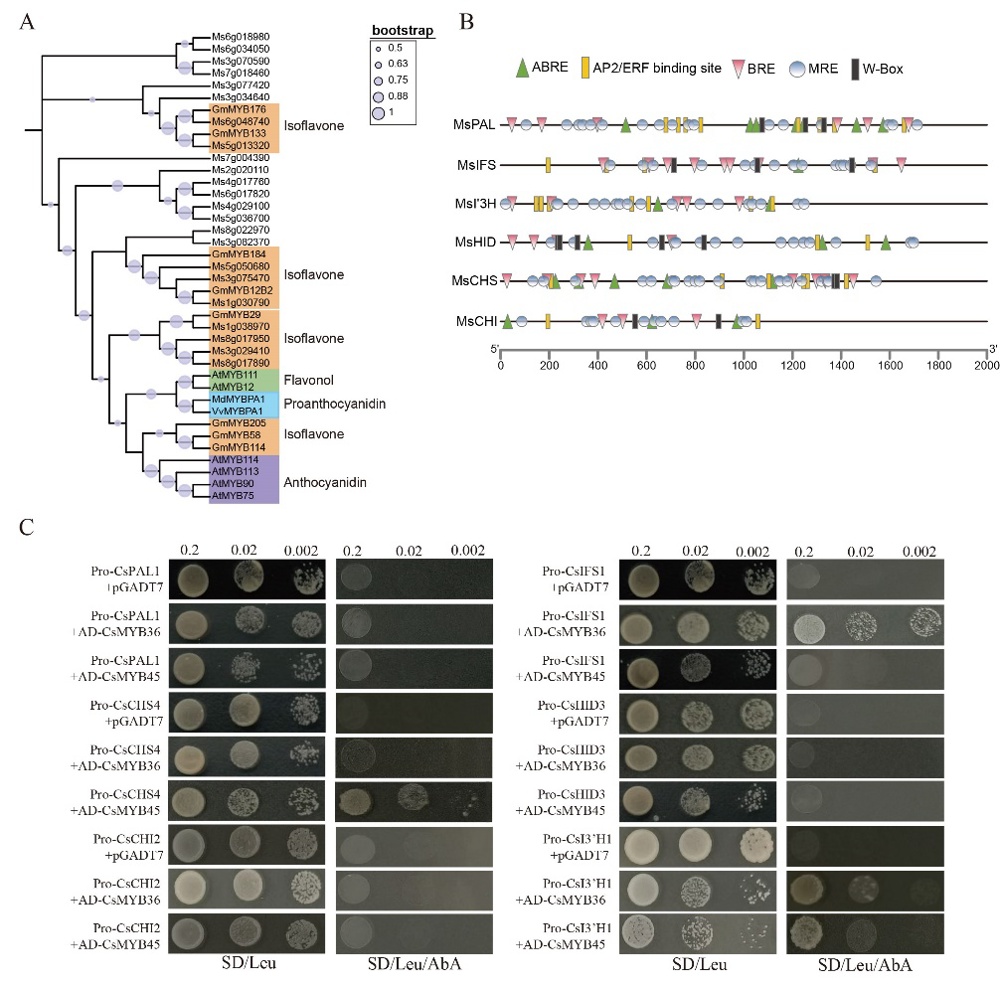 此外,我们还通过WGCNA构建了调控牛大力异黄酮生物合成的“代谢物-结构基因-转录因子”调控网络,并锁定了参与调控牛大力异黄酮生物合成的候选转录因子,利用酵母单杂交验证了CsMYB36转录因子可结合牛大力异黄酮生物合成途径基因CsIFS1、CsI3’H1的启动子,CsMYB45可结合牛大力异黄酮生物合成途径基因CsCHS4、CsI3’H1的启动子(图3)。