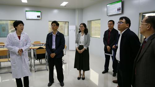 钟会超(左二)在taptap点点体育副校长冷静(左三)陪同下参观taptap点点体育石墨烯生物医药应用技术研究院和药学院