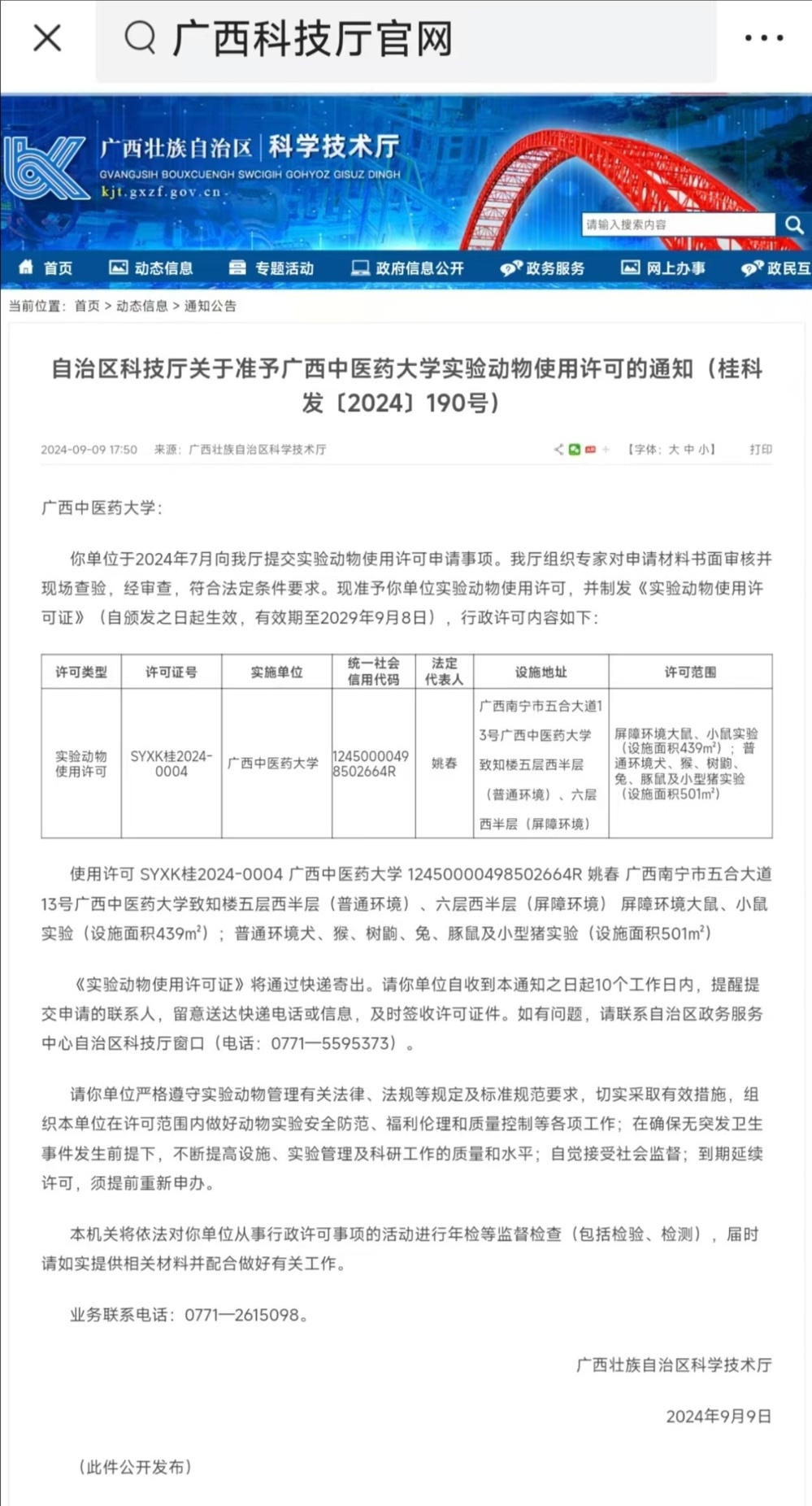 2024年9月9日,广西壮族自治区科学技术厅网站发布了“自治区科技厅关于准予taptap点点体育实验动物使用许可的通知(见下图)”,准予点点体育新的实验动物使用许可(许可证号:XYXK桂2024-0004,自颁发之日起生效,有效期至2029年9月8日)。