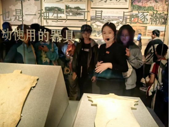 依托自治区博物馆丰富馆藏,两门课程教学团队重点引导学生参观“合浦启航—广西汉代海上丝绸之路”展厅与广西古代文明陈列展厅。在海上丝绸之路展厅,学生通过琉璃、琥珀等外贸文物及船舶模型,直观感受古代商贸中的开拓精神与文明互鉴;以医药交流遗迹为切入点,探究和谐、敬业、诚信等传统价值观对中医药传承与国际化发展的基础作用。在古代文明展厅,羽纹铜凤灯、翔鹭纹铜鼓等镇馆之宝及民族融合相关文物,让学生领略广西多民族交往交融历程,深化了对中医药在民族交流中重要作用的认知,接受了铸牢中华民族共同体意识的生动教育。