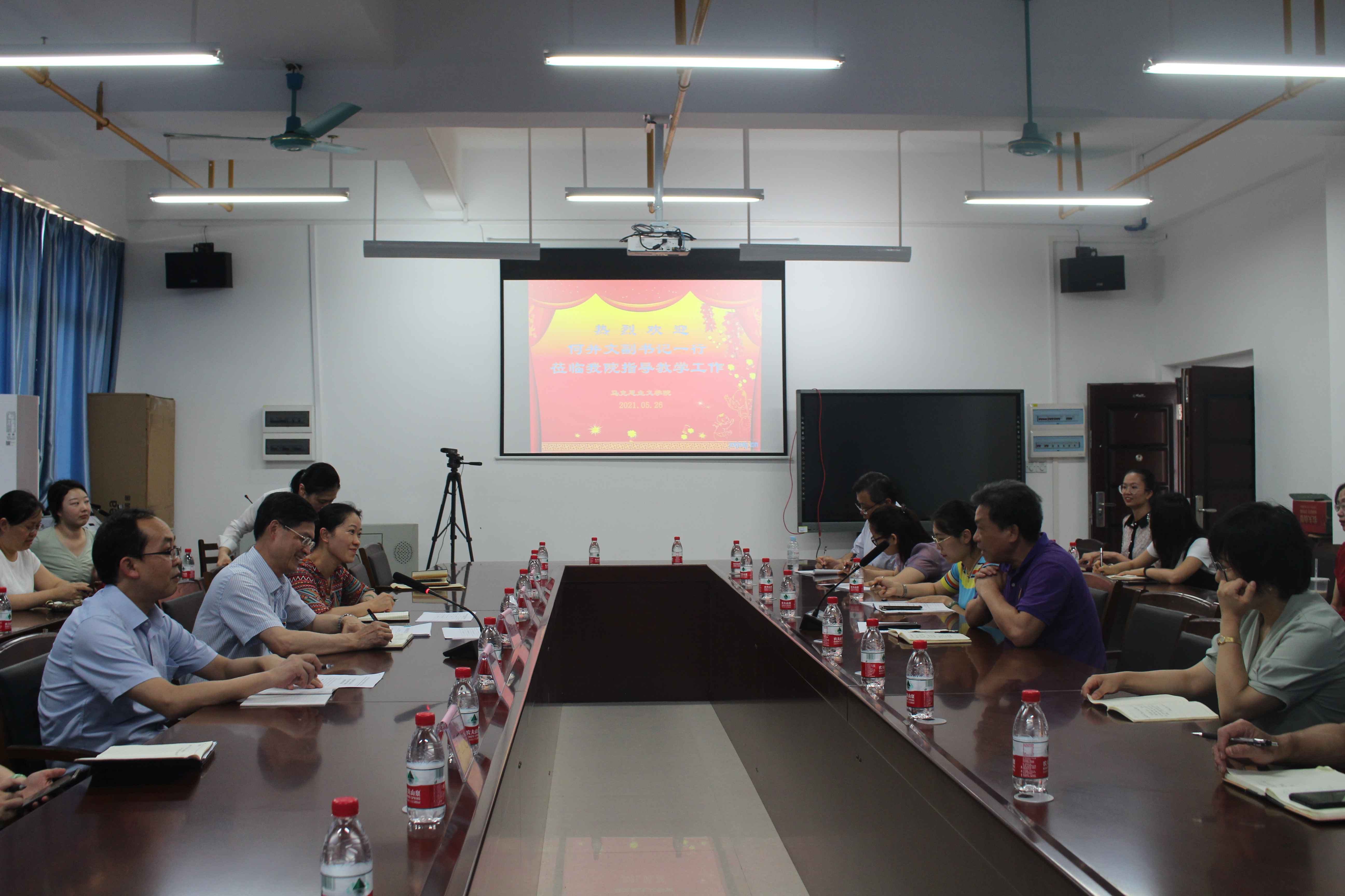 5 月 21 日 下 午,点点体育党委 副 书记 何并文 带队到马克思主义学院(以下简称马院) 指导教学工作 ,就马院 的教学中期检查 工作 及 教学科研、学科建设等方面工作进行 检查指导 。并与马院全体教职员工座谈交流。 校 组织部部长唐振宇、教务处处长莫雪妮、学工处处长叶勇玲、学工处副处长曾淑文、教评中心蓝丽霞、李静 参加 会议, 会议由马院院长韦兆钧主持。