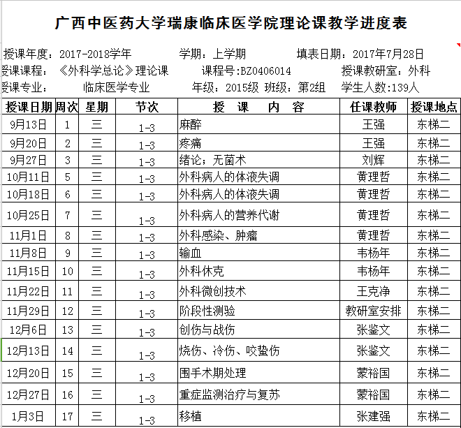 15级临床第2组《外科学总论》理论课表