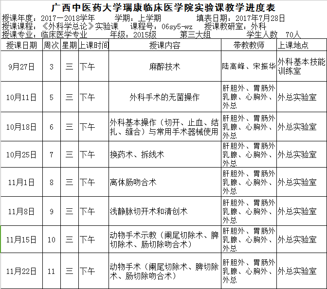 15级临床第3大组《外科学总论》实验课进度表