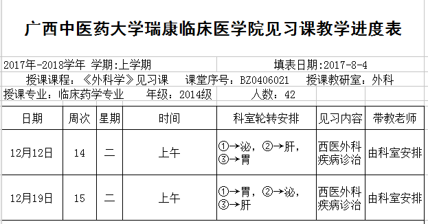 2017-2018上15级临床药学《西医外科学》见习进度表